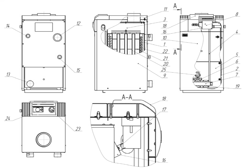 The decoratory case of the device consists of two side 9 , front 10 and upper walls 11 . The gas fittings governing bodies are removed through the top wall of its front part. Access to governing bodies in KT 20 TS(P2), KT 20 TV(P2) and KT 30 TS(P2) devices is limited by decorative opening plastic cover 18 . The branch pipes 12 and 13 which can be located both on the back wall, as well as on sidewalls of the device, depending on its model are removed by for device connection to outer heating pipelines from its corresponding elements. The GVS edge’s pipeline connection is piped behind through branch pipes 14, 15 . The combustion products formed in furnaces pass through heat recovery system consisting of several fire-tube 20 rows where stainless steel turbulizers 21 are placed for heat exchange intensification. The draft stabilizer 16 is located over the heat recovery system with the draft sensor 17 mounted on it. The draft stabilizer is intended for external meteorological factors (temperature, humidity, wind speed) per furnace draft intensity influence decrease.Devices compile of such parts:
