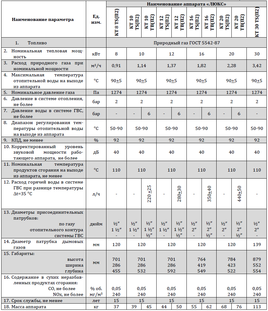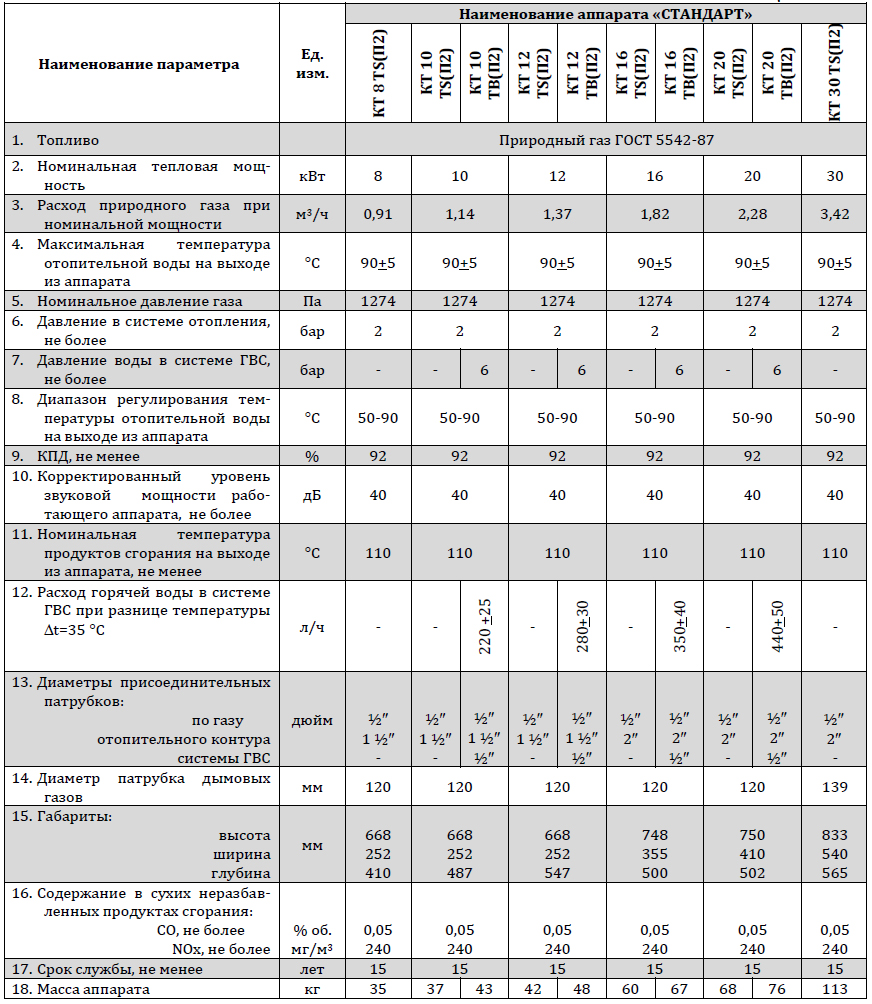 Household heating gas devices with KT TS(P2) steel heat recovery system are intended for water heating in water heating systems only. KT TV(P2) with the steel heat double-circuit recovery system devices are intended water heating in water heating systems and water heating for hot water supply (with copper heat recovery system’s bypass duct). By placing main body’s special design copper exchanger into water cavity it is possible to produce hot water for household needs. Copper heat recovery system’s thermal capacity does not exceed the unit’s nominal heat output.