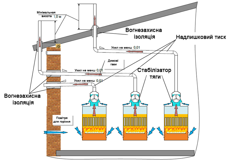 In figure 3 have provided schemes of withdrawal of products of combustion for several of floor gas coppers of KTH CE (T) to a general flue. The general flue, at the same time, in case of all operating modes in all range of weather conditions (for providing GVS – that and during not heating period), shall provide steady depression in points of connection of gas flues from coppers.