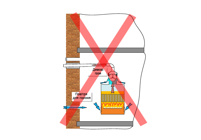 In figure 5 has illustrated the case forbidden to application for installation of coppers on lower floors of residential and public buildings – the installation of a floor gas copper of KTH CE (T) with removal of combustion gases through a wall. The installation of a floor gas copper of KTH CE (T) with removal of combustion gases through a wall on lower floors of process buildings can be admissible if the deaf facade is located above and there are no zones of stay of people. For this case it is necessary to provide, generally, a gas flue exit through a wall on a mark not lower than 2,2 m over pass level.