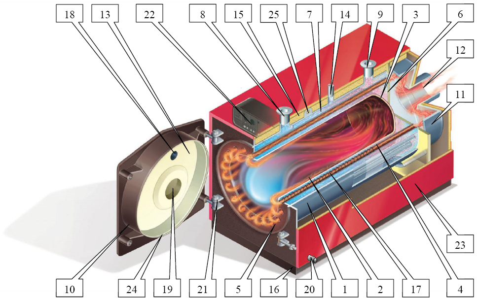 In terms of design the boiler represents horizontally located combined and welded cylindrical construction consisting of an outer mold mine — the boiler’s case (pos.1 in figures 1 and 2), a hub with the bottom — boiler’s furnace (pos.2 and pos.3) and flue-gas pipes (pos.4) welded with front and back pipe walls (pos.5 and pos.6). Construction is located on a mounting frame (pos.16). The internal cavity formed by boiler’s case and furnace is its hydraulic circuit (pos.7). The bundle of flue-gas pipes is located in hydraulic path’s cavity. The coolant’s addition and discharge– water is carried out through the ” reverse T2 water” (pos.8) and “direct T1 water” (pos.9) branch pipes, located on the boiler case’s upper generatrix. There is also the safety valves mounting branch pipe (branch pipes) is located on the boiler’s case upper generatrix. The guide path is located in water path’s cavity (pos.28) provides heat carrier’s flow to a heat-stressed leading pipe wall.