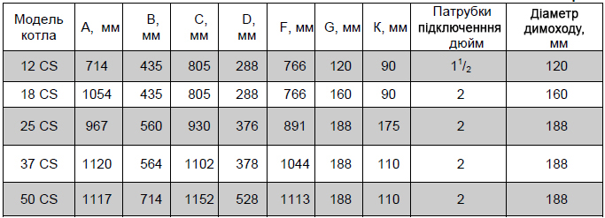 | 12. Габаритні розміри котла • глибина • ширина • висота | мм | 714 435 805 | 1054 435 805 | 967 560 960 | 1120 564 1102 | 1117 714 1182 |
