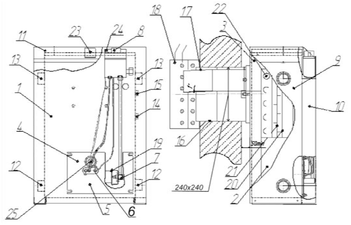 Повітрозабірний короб 16 та короб для відведення відпрацьованих газів 17 виконані у вигляді телескопічної конструкції, що дозволяє вивести їх через зовнішню стіну товщиною від 250 до 600 мм. Із зовнішнього боку стіни кріпиться вітрозахисний кожух 18, що сприяє стійкому відведенню продуктів згоряння на вулицю і підводу повітря для горіння з вулиці. Конструкція забезпечує нормальний процес горіння при швидкості повітряного потоку до 16 м / с.