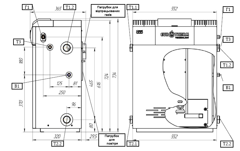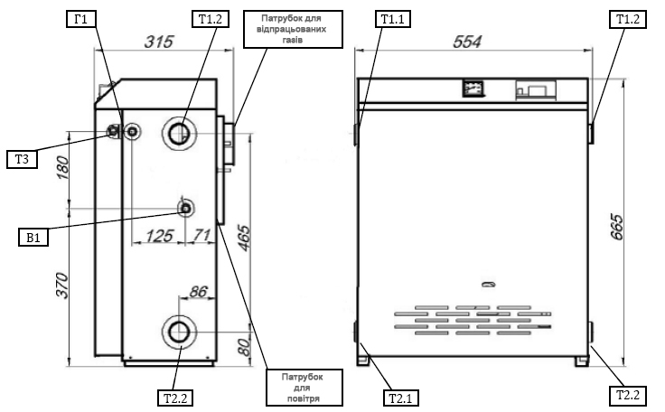 - Т1.1 и Т1.2 – вихід води в систему опалення (пряма вода) зліва і справа відповідно;